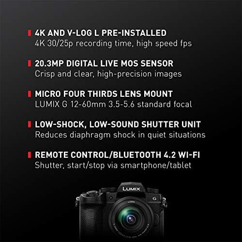 Panasonic LUMIX G95 20. 3 Megapixel Mirrorless Camera, 12-60mm F3. 5-5. 6 Micro Four Thirds Lens, 5-Axis Dual I. S. 2, 4K 24p 30p Video, Pre-Installed V-Log L, 3” Flip-Out Touchscreen – DC-G95MK (Black)