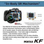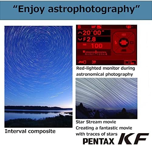 The PENTAX KF offers outstanding imaging performance in a compact body. Featuring dustproof, weather-resistant construction and dependable cold-proof performance down to temperatures as low as -10°C, it’s optimized for all types of outdoor photography. It incorporates a host of advanced functions and user-friendly features including a pentaprism-type optical viewfinder with a nearly 100% field of view and 0.95-times magnification and an in-body shake-reduction system with a 4.5-shutter-step compensation. Built with the photographer in mind, the grip, control buttons on the back panel and mode dials are contoured to offer optimum comfort and operability. The high-definition vari-angle LCD monitor makes it easier to compose images in a wide variety of applications, while the unique Night Vision Red Light LCD function minimizes eye strain and fatigue for nightscape and astrophotography.