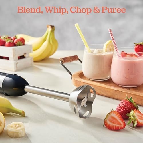 Powerful Blender – The hand blender has a motor of 500 watts and 4 sharp blades, grinding unruly lumps, stubborn clumps, tough meats, and rock-hard fruits for smoothies, soups, milkshakes, and batters.