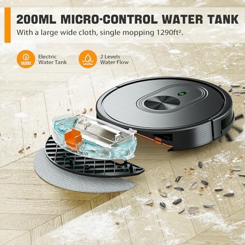 ✅【3-in-1 Robot Vacuuming+Mopping+Sweeping】 HR101 Robot vacuum and mop combo combination can quickly remove dust, paper scraps and pet hair.Equipped with 250ml dust box and 200ml water tankas well as a roller brush. The electronically controlled water tank has 2-speed water outlet modes, and the penetration is uniform, which is suitable for all hard floors. The water output can be precisely controlled by App or remote control. The 250mL dust box can hold more garbage, and the powerful suction motor with the roller brush can make vacuuming easier.Dry and wet two washes, meet different cleaning needs, and completely free your hands.