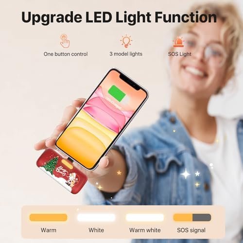 4 Modes LED Light & Fast Recharging: small portable charger with LED lantern that can be switched to 3 colors of warm – white – warm white, you can use it as fill light for selfies and flashlight in the dark. Recharging the cell phone charger for 50% power within 30 mins with provided USB C cable and adapter(not included), which can charge your iPhone 14 from 20% to 60% without using the phone.