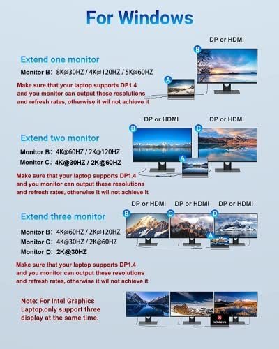 【DOCKING STATION FOR GAMING LAPTOP】This triple monitors USB C hub allows you outputting single 8K@30HZ, 4K@120HZ or 5K@60HZ monitor, 4K@60HZ and 4K@30HZ dual monitor, 4K@60HZ, 4K@30HZ and 2K@60HZ Triple monitor under DP1.4 protocol.(❤️Note: MacOS system, the screens of external monitors are the same, no matter they are displayed in mirror mode or extended mode.)